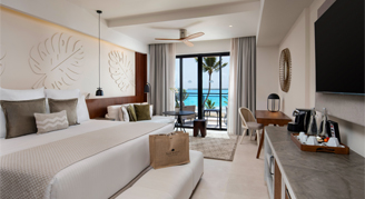 Located on the ground floor of the Preferred Club buildings with direct pool access, these oceanfront suites feature a rain shower, full-length mirror, beauty station, double vanities, and an ample closet area.