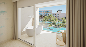Suites feature views of the pool and sundeck, and face the interior of the resort. Located on floors 1 - 4, and amenities include a king-size bed, sofa bed, mini-bar for a fee, robe and slippers, and a whirlpool on the balcony.