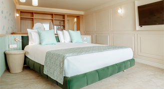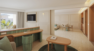 These suites come with butler service to elevate your stay. Suites features a full ocean view and are located on floors 1 - 2 at the end of the wing. Amenities include a king-size bed, a separate living room with plenty of space for your comfort, mini-bar for a fee, robes and slippers, and a whirlpool on the balcony.