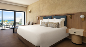 Suites feature an ocean view, two double beds, full bathroom, double vanities, and a private furnished balcony with a soaking tub.