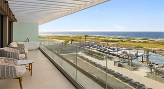 Suites feature an ocean view, one king bed, full bathroom, double vanities, and a private furnished balcony with a soaking tub.