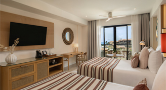 These oceanfront suites feature a rain shower, full-length mirror, beauty station, double vanities, an ample closet area and a furnished balcony overlooking the ocean.