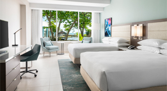 Experience a private paradise with convenient pool access and lush resort views. Located on the lower level of the Beach Wing, this room features two double beds, a private balcony, and a pull-out chair suitable for one child.