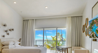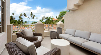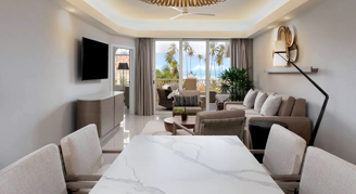Rooms feature an ocean-view, living area with a pull-out sofa, a private balcony, a kitchenette, and a bathroom with a separate shower and tub.