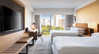 Rooms feature city views and a separate living area.