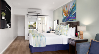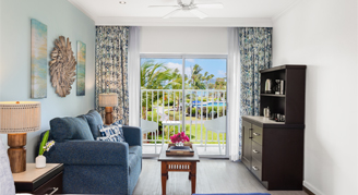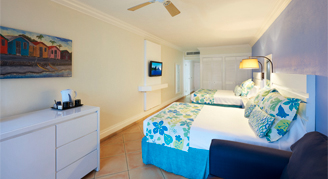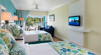 Located on the third floor with views of the Atlantic Ocean and CocoLand waterpark. Rooms have one king and trundle twin beds or two queens with a sofa. Rooms also offer a flat-screen TV, ceiling fan, air conditioning, balcony, iron and board, safe, radio alarm, a bar with a mini-fridge stocked with water, soft drinks and local beer (by request); and coffee/tea service.