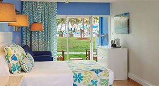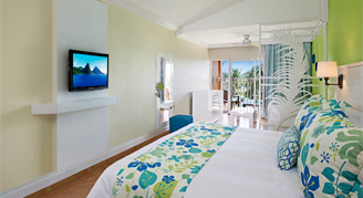 Located on the third floor in the Harmony adults-only wing with vast views of the Atlantic Ocean, pool area and gardens. Rooms have one king or two queen beds, a ceiling fan, air conditioning, balcony, iron and board, safe, flat-screen TV, radio alarm, a bar with a mini-fridge stocked with water, soft drinks and local beer; and coffee/tea service.