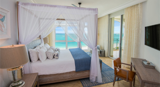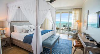 Suite features a kitchenette and a four-poster king bed overlooking the ocean.