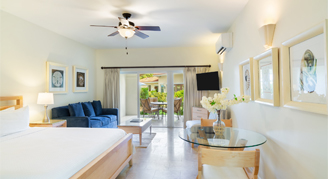 The luxury three-bedroom suites combine a two-bedroom luxury suite with a deluxe studio, offering space and comfort for larger groups. Each suite features a full kitchen, multiple living areas, and large furnished balconies for seamless indoor-outdoor living. Perfect for families or friends seeking upscale accommodations near Grace Bay Beach.
