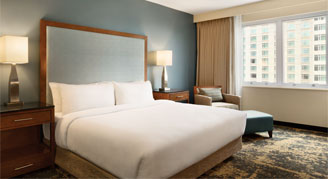 This premium suite features a private bedroom and separate living area with a sofa bed and wet bar with microwave and refrigerator. Enjoy upgraded amenities such as an assortment of non-alcoholic drinks, snacks and coffee pods that are replenished daily.