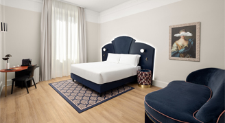 The Deluxe Room, with its ample space, welcomes you to a sophisticated yet eccentric atmosphere. Its stylish décor combines contemporary design with references to the revolutionary arts of early 1900s for an out-of-the-ordinary stay in downtown Florence. The distinctive striped bathroom completes the bold character of this unconventional room in the heart of Florence.