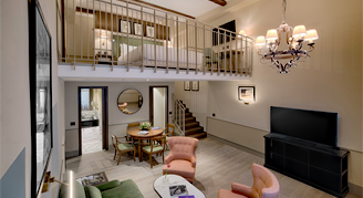 Suites are comprised of two-level rooms with an internal staircase. The lower floor features a large living room for relaxing, while the upstairs offers a comfortable bedroom.