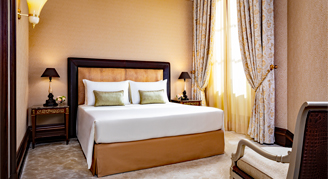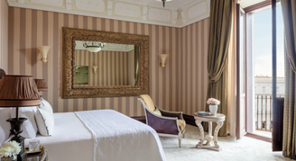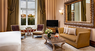 Slightly smaller than the Junior Suite, this suite overlooks the piazza and Fountain of the Naiads. Ideal for families, with extra space to work or lounge, these suites also feature a white marble bathroom with Acqua di Parma amenities.