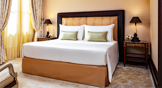 Deluxe Rooms are cozy yet airy, with high ceilings, natural light and classic design details such as intricate figurine lamps by the bed. Bedding options consist of a comfortable queen bed or two twins. King beds are available in some rooms. The luxurious bathroom features floor-to-ceiling travertine marble, an oversized rain shower and Acqua di Parma amenities.