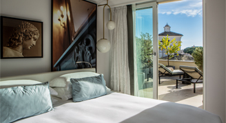 With a calming color scheme of white, soft turquoise and gold, these completely renovated rooms are an ideal space to come back to and relax after experiencing the lavish historical art and architecture of Rome. Blending elegance and comfort, the rooms include Italian inspired contemporary art, complimentary Wi-Fi, an espresso machine, and white marble bathrooms with Hermès products.
