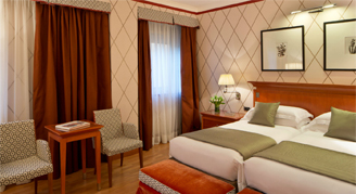 Rooms feature classic cherry wood furniture, splendid silver leaf-plated mirrors and luminous bathrooms of delicate Italian marble.