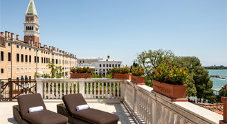 Suites feature a spacious living area, marble bathroom, and a private terrace overlooking San Marco and the San Giorgio Basin.