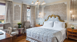 Spacious suites feature one bedroom, an elegant living room with antique furniture and a marble bathroom. Suites offer views of the Venetian streets or the serene inner courtyard.
