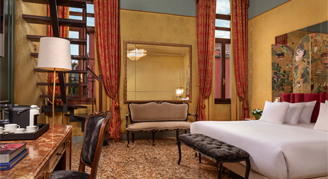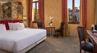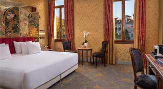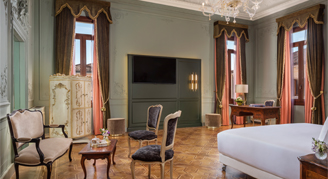 Inspired by the glories of the Venetian Palaces, these rooms are refined with brocade, marble and Venetian glass.