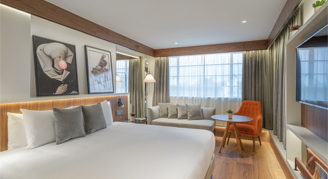 Room features avant-garde design and elegant decoration with views of the city from its large window. It provides a queen bed, a coffee table and dresser, flat-screen TV and bathroom with a rain shower.