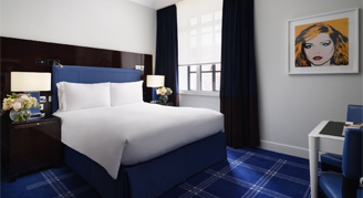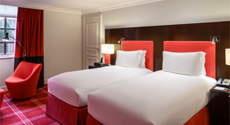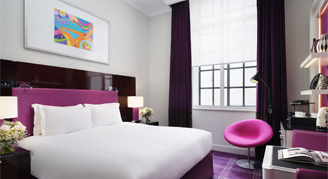 Effortlessly blending pop-art culture, French modernism and British old-world elegance, Sofitel London St James abounds in rich colors of British heritage shades of green, blue, red and purple, accented by lacquered mahogany furniture and thick carpets.