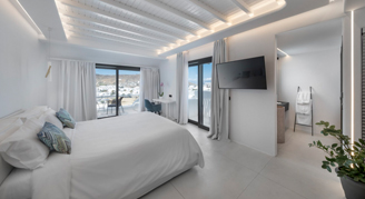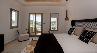 Pool Suites are located on the fourth floor, offering modern amenities and a great infinity pool with stunning views of Ornos Bay. Features include a king-size bed, a bathtub and a spacious private balcony.