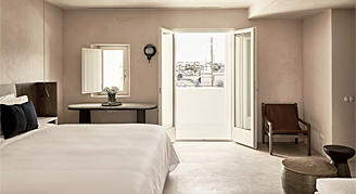 Nestled into the cliffside overlooking the Aegean Sea and Delos Island, this hotel offers a “barefoot chic” aesthetic throughout, blending traditional, minimalist, Cycladic elements and stunning modern design.