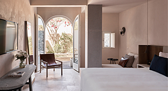 Nestled above the sun kissed beach of Agios loannis, Katikies Mykonos warmly invites guests to unwind and bask in the sophisticated tranquility of modern luxury. Private suites and expansive verandas overlook the azure sea evoking a sense of blissful serenity.