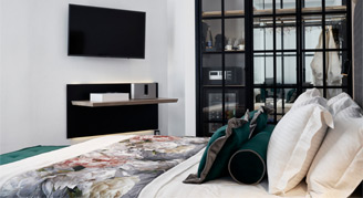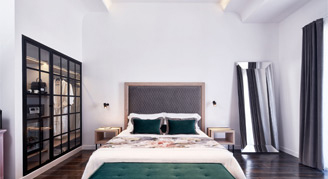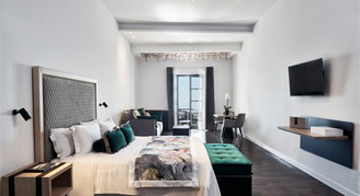 With cozy alcoves framing the bedroom and an open plan sitting area, the Garden-View Junior Suite is a simple yet sophisticated space. Suites are elegantly appointed with charcoal parquet flooring, and splashes of warm teal and pastels.