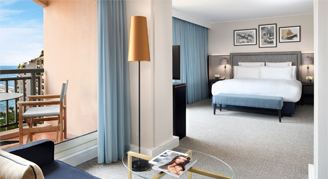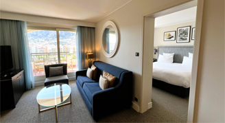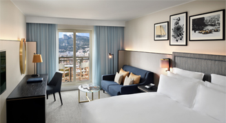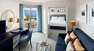 Upgrade to this stylish Top-Floor Suite for additional space and comfort. The open-plan layout features a bedroom with twin beds and a comfortable living room. Relax on the balcony and look out across views of the Rock of Monaco, or the pool and Mediterranean Sea. The Riviera-style décor features calming shades of blue and ochre for a tranquil atmosphere. Start your day with coffee from the espresso machine and unwind with a program on the HDTV. The spacious bathroom features a bathtub and a walk-in shower. Additional amenities include complimentary Wi-Fi, a mini-bar, laptop safe, iron with board, and USB ports.