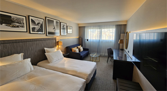 The hotel's 181 rooms, including 29 suites, were entirely renovated in 2018. Accommodations are decorated in shades of blue and ochre for a tranquil atmosphere. Additional amenities include a laptop safe and USB ports.