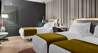 Refined furniture, a contemporary look and a showstopping wallpaper create an elegant and serene atmosphere, perfect for a comfortable guest room. These rooms will provide a pleasant space where you can work, relax and get a good night' sleep. Rooms come with free in-room Wi-Fi and a variety of other modern comforts.