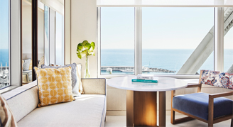 Located mid tower, the Horizon Sea-View Suites occupy a corner position that fully embraces panoramic views of the sparkling Mediterranean Sea. Large windows invite abundant natural light, while earthy tones inspired by the surrounding Catalan mountains enhance the sense of calm and connection to nature.