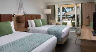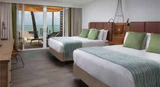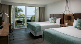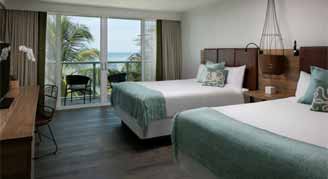 Watch the sunrise from your private lanai in this coastal chic suite that features two premium queen beds and queen sleeper sofa with, upscale toiletries and a coffee maker. This suite includes covered patio with lounge chairs, just steps from the beach.