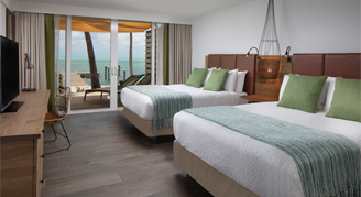 Unmatched ocean views await in this spacious one-bedroom suite with two premium queen beds. The main living area offers access to a private oceanfront patio, queen sofa bed and loveseat, and a kitchenette and dining table.
