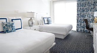 ADA-compliant room featuring two Queen Beds, accessible deluxe bathroom and furnished outdoor living area overlooking the ocean. Located on the first floor.