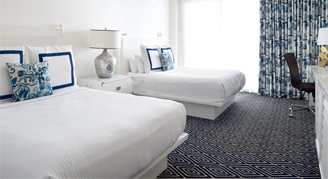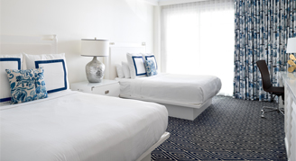 This two-bedroom guestroom features one King bed in each room. It also includes two deluxe bathrooms and a furnished outdoor living area. Located on floors two or three.