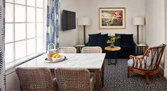 In this two-bedroom, two-bath oceanfront room, open the large sliding doors to your gorgeous furnished outdoor living area overlooking the ocean and savor the breathtaking sunrises and sunsets the Keys are so famous for. Inside you'll find a spacious two-bedroom guestroom with two queen beds in the primary room and one king bed in the second room, luxurious finishes, fine touches, and thoughtful details. Located on floors two or three.