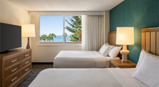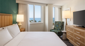 Savor the ocean breeze from this suite with a partial-ocean view on a Juliet-style, stand-up balcony, inviting you to relax and breathe in the warm coastal air. The living room features a comfortable full-sized sofa bed, a well-lit dining/work table, and a sliding door that leads to the balcony, offering a seamless indoor-outdoor experience. Rejuvenate in one of the two full-sized bathrooms, stocked with complimentary toiletries for your convenience. Enjoy the comforts of home with amenities including a microwave, refrigerator, coffeemaker, in-room safe, iron/ironing board, and WiFi access. Delight in your favorite shows on one of the suite's two flat-screen televisions.