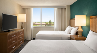 This suite features two comfortable queen beds and a full-size sofa bed. Slide open the glass doors to your Juliet-style, stand-up balcony and enjoy the fresh air. The sitting area is equipped with a well-lit dining/work table, perfect for meals or catching up on work. Entertainment is at your fingertips with two flat-screen televisions. Each suite boasts a bathroom stocked with toiletries and a hairdryer for your comfort. Additional features include a wet bar area complete with a microwave, refrigerator, and coffeemaker, as well as an in-room safe, iron and ironing board.