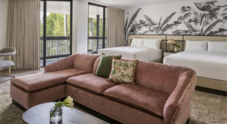 Cool tones, clean lines, and a colorfully modern, naturally textural palette with tropical touches make up this Palm Beach resort room featuring one king bed, custom wood headboards, a tropical black and white wall mural, bold color nightstands and media console, a pink pineapple lamp, arc lamp, 55’’ LCD HD TV, sitting area, and an executive desk. The spa-style bathroom has free-standing metal vanities with white quartz tops, a custom illuminated mirror, white terrazzo tile floors, black porcelain wall tile, and a separate vanity area.