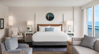 Wake to breathtaking ocean vistas in this thoughtfully appointed room. The king bed, dressed in premium linens, is your cloud-like retreat after each day by the sea. Floor-to-ceiling windows and an open-air balcony invite you to soak in gentle breezes and endless blue horizons. Enjoy contemporary amenities, a soothing color palette, and inspired coastal touches that bring the outside in.