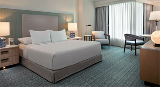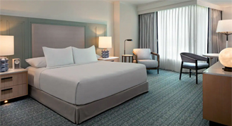 Experience Tampa from an accessible room with a king bed featuring tall windows that allow for an abundance natural light, a mini-fridge and fully accessible features throughout.