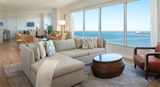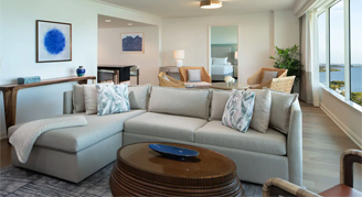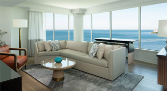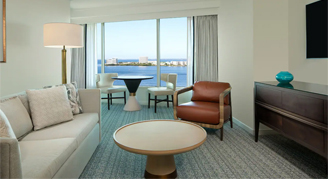 Experience luxury in this suite featuring panoramic views of the bay through expansive windows, separate living and dining spaces, a wet bar with a half-size refrigerator, and a large bedroom with a king bed. The bathroom features a separate tub, double sinks and a glass-enclosed shower for guests as well.
