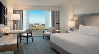 Rest comfortably in this room featuring a king bed, abundant natural light, picturesque city views, a mini-fridge and a modern bathroom with a glass-enclosed shower.