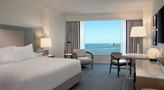 Enjoy spectacular views of the bay from a suite located on floors 10 – 12, featuring a large bedroom with a king bed, a separate living area with expansive windows for natural light and a bathroom with a glass-enclosed shower.
