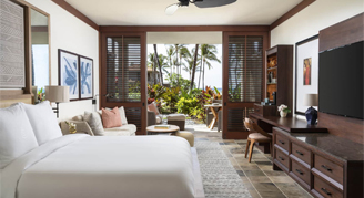 Poolside Rooms are located on the lower level in the Seashell or Beach Tree crescents and feature views of the property gardens. Rooms feature a Nespresso machine, 65-inch LED TV, Klipsch wireless Bluetooth speakers and Makana Honua bath amenities.