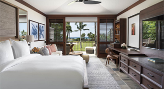 Golf/Ocean-View Rooms are located on the upper and lower level in the ‘Ulu Terrace and feature views of the Jack Nicklaus Hualalai golf course. Rooms feature a walk-in closet, Nespresso machine, 65-inch LED TV, Klipsch wireless Bluetooth speakers and Makana Honua bath amenities.