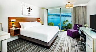 Rooms feature scenic oceanfront views with outdoor seating, and offer a spacious desk with ergonomic desk chair and a stylish bathroom with a bathtub/shower combination. Additional features include complimentary Wi-Fi, a 48-inch HDTV, an alarm clock, hairdryer, microwave, mini-fridge, in-room safe, cordless phone, and a coffeemaker with local coffee flavors.