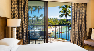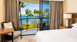 Rooms are located in the Makai Tower, near the Kohala Spa, saltwater lagoon and Lagoon Grill restaurant and feature views of the ocean from the lanai. Additional amenities include a large shower and Kolala Spa Mango bath products.